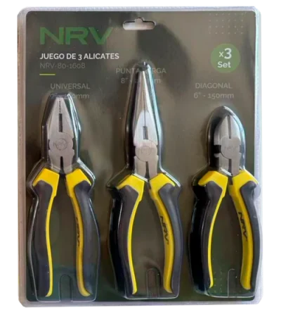 3 piezas: 1) Alicate universal de 180mm 2) Alicate de punta larga de 200mm 3) Alicate diagonal de 180mm